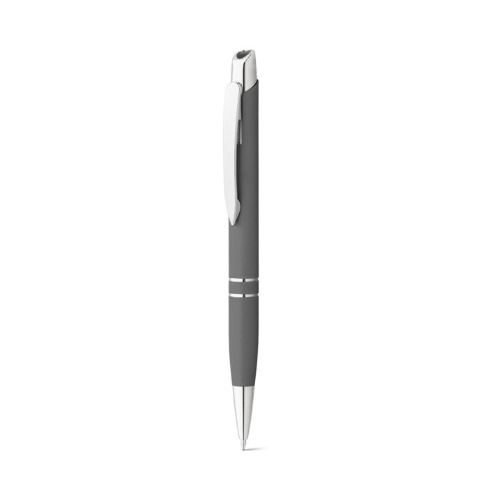 Aluminium ball pen with rubber finish and clip. Blue ink