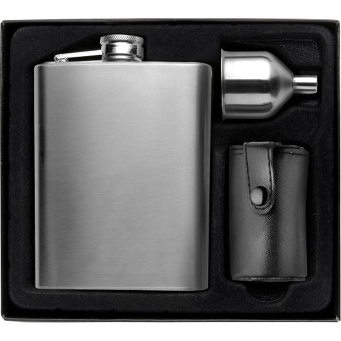 Six piece stainless steel drinking set consisting of a hip flask (220ml) with four cups (30ml) and a funnel.