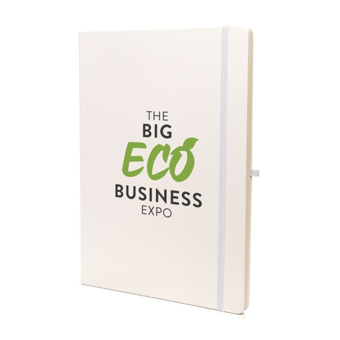 Promotional A4 White Mole Notebook. A4 white PU soft finish 80 sheet lined notebook with white bookmark, back pocket, coloured elastic pen loop and elastic closure.