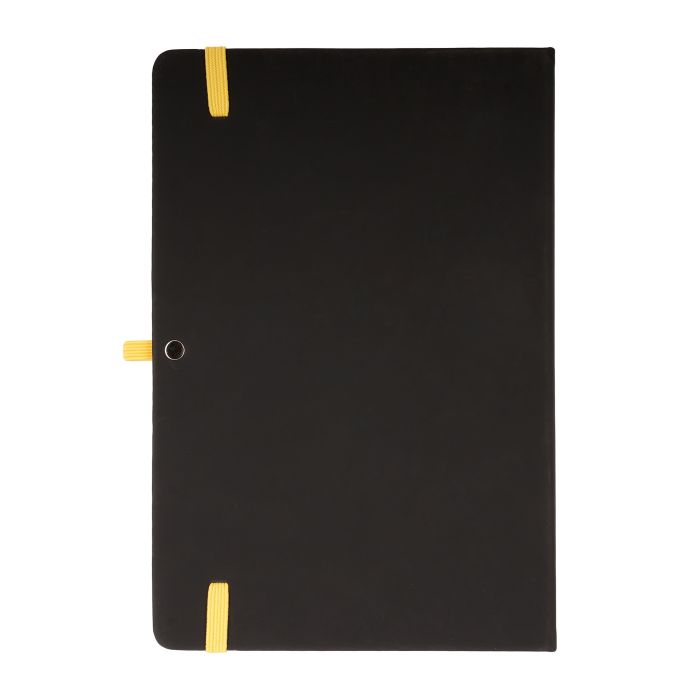 A5 black PU soft finish 80 sheet lined notebook with coloured bookmark, back pocket, coloured elastic pen loop and coloured elastic closure.