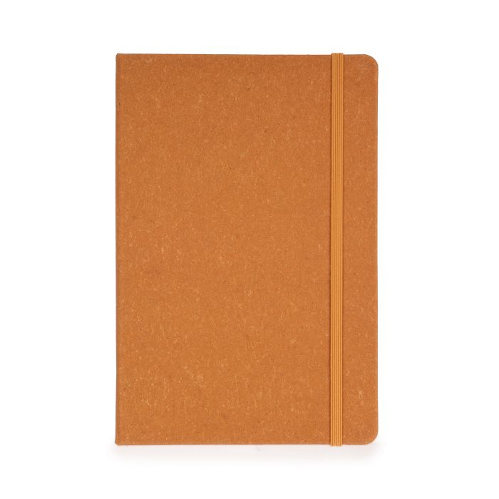 A5 bonded hardcover notebook with a 75% recycled leather cover, 96 lined cream sheets, ribbon bookmark and black elastic closure.