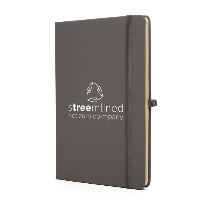 Recycled notebook with 80 sheets, PU coloured cover, pen loop, back pocket, ribbon bookmark and elastic closure.