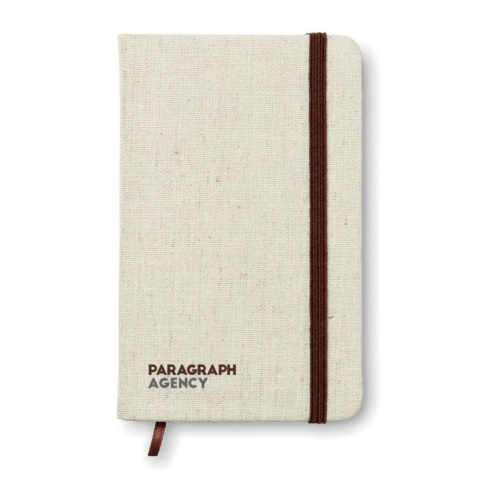 Promotional RUNDO + A6 Canvas Notebook lined, Corporate A6 notebook with hard canvas cover. Casebound. 192 lined recycled paper pages (96 sheets). Contrasting elastic closure strap and ribbon page-marker.