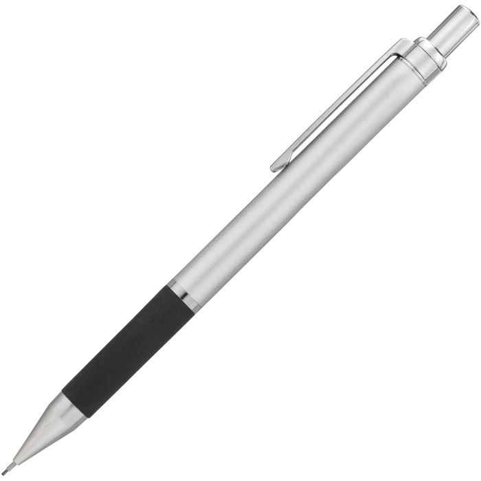 0.7mm 2B retractable lead pencil with stainless steel barrel. Includes an integral eraser, spare lead and comfort grip.