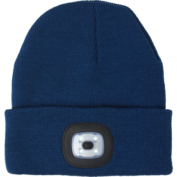 Acrylic beanie hat with a COB light. The removable light has three settings. Batteries included.