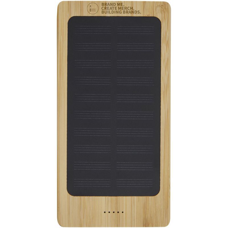 Promotional Alata Bamboo Solar Power Bank 8000 mAh. Branded 8000mAh bamboo power bank with dual USB output. Integrated solar panel for quick topup charging, ideal for outdoor activities. 5V/2A Type-C input, 5V/1A USB output 1 and 5V/2A USB output 2. Delivered in a gift box with an instruction manual (both made of sustainable materials).