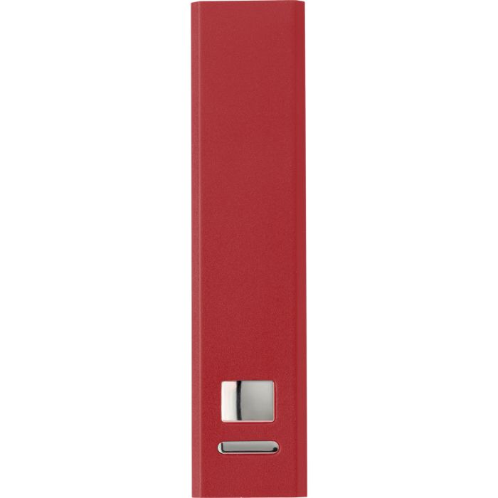 Aluminium power bank with Li-ion battery, with a capacity of 2600mAh, input of 5V/1000mA and output of 5V/1000mA. Includes a USB/Micro USB cable, suitable for most electronic devices.