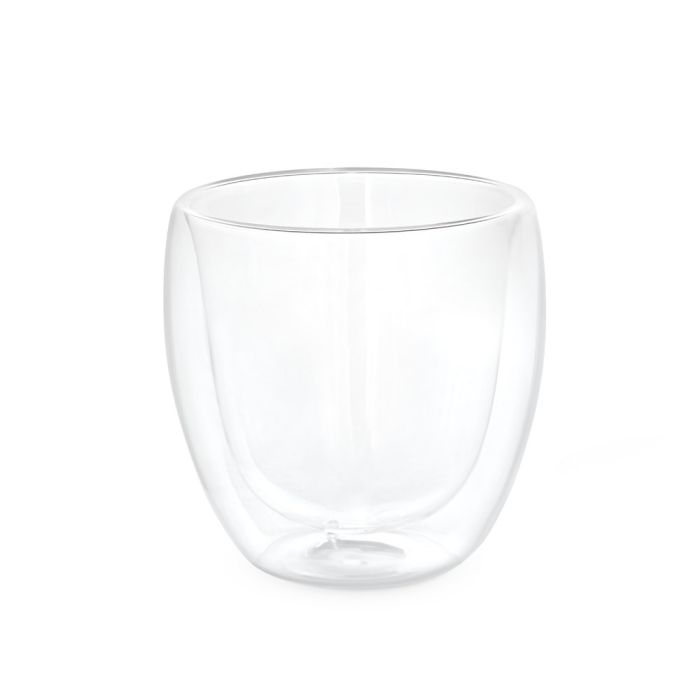 Isothermal glass cup with air-insulated double wall and capacity up to 220 mL. Supplied in a customisable gift box. ø80 x 86 mm