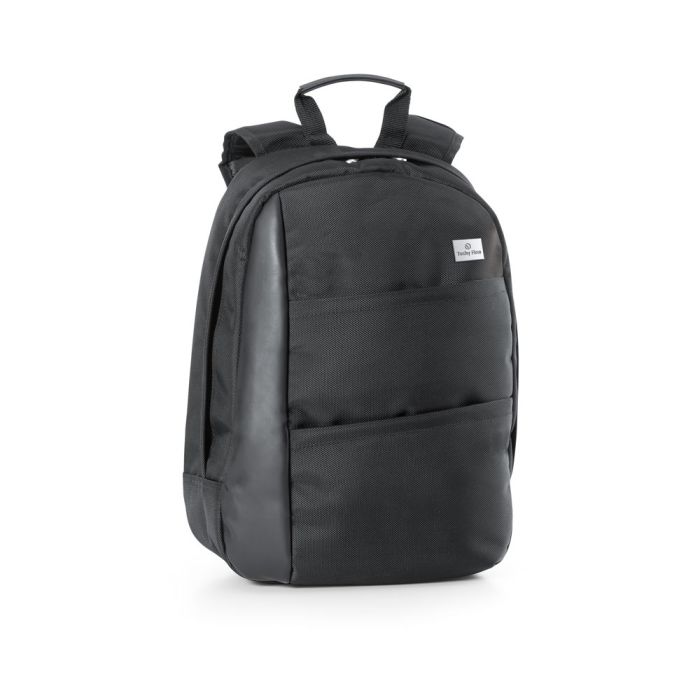 Laptop backpack in PU and 1680D. Compartment with padded partition for laptop up to 15.6''. Lined and padded interior. It contains several interior pockets. The backpack has 2 front pockets and a customizable board. Padded straps and back with padded support system for the back. Capacity up to 17 L