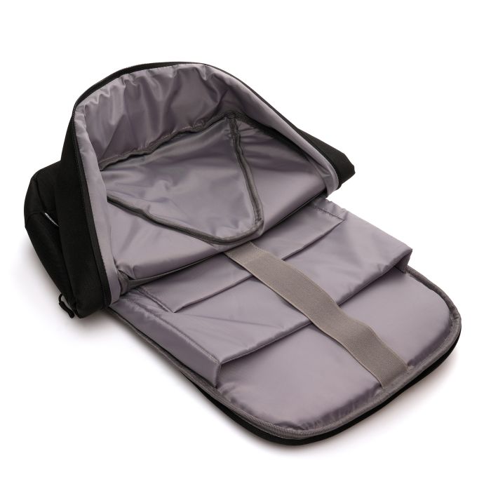 With a capacity of 19L this anti-theft backpack boasts a large main compartment for documents and clothes, a padded laptop compartment with hook and loop closure, padded pocket for tablet, a luggage strap attachment and zipper pocket to the back and top.