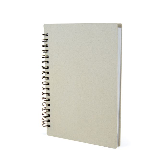 Spiral bound notebook made from ABS plastic and wheat straw with an antibacterial coating. Includes 70 sheets of lined white paper.