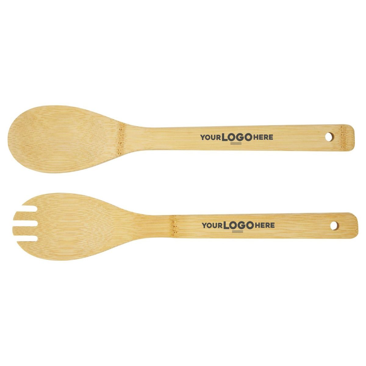 Promotional Argulls Bamboo Salad Bowl with Serving Spoons. Bamboo salad set with a classic round-shaped bowl, salad spoon, and a salad fork, which is practical for everyday family dinners. The bamboo used is sourced and produced following sustainable standards. Branded Bamboo Products.