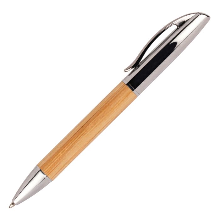 A quality twist action ball pen comprised of a bamboo barrel with attractive metal trims, which adds a substantial and weighty feel to the product.