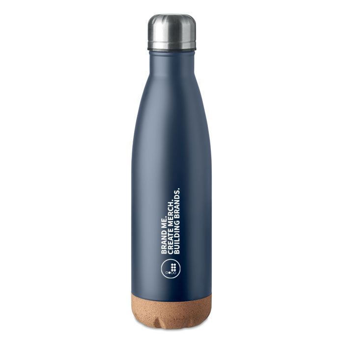 Printed ASPEN CORK Insulated Bottle Stainless Steel And Cork 600ml. Double wall stainless steel vacuum bottle with cork base detail. Capacity: 600 ml. Leak free.