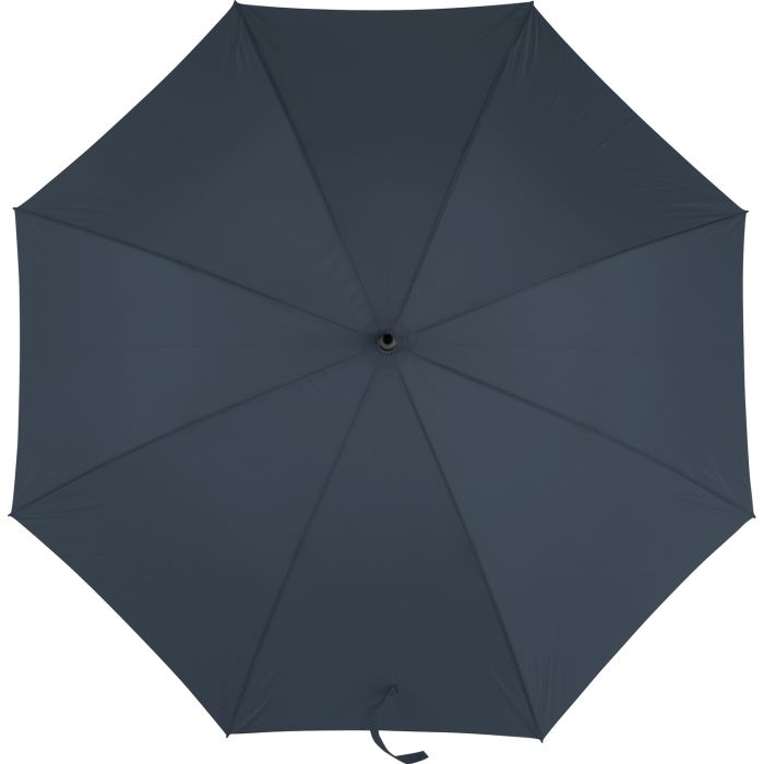 Promotional Automatic Umbrella with Rubber Handle. Automatic polyester (190T) umbrella with eight panels a metal shaft and tips, fibre glass ribs, a rubber handle, Velcro closing, and matching pouch.