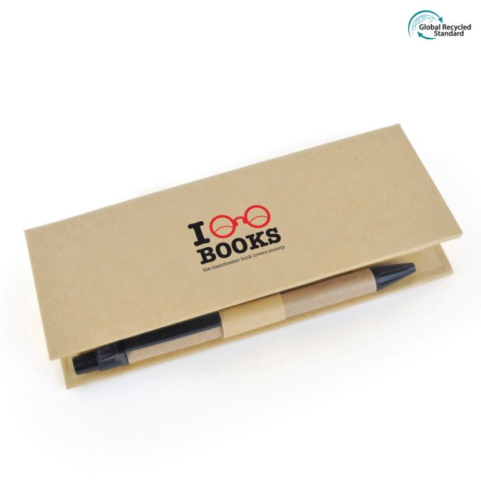 Desk set including sticky notes, flags, ruler and pen. All housed in a stylish recycled paper box.
