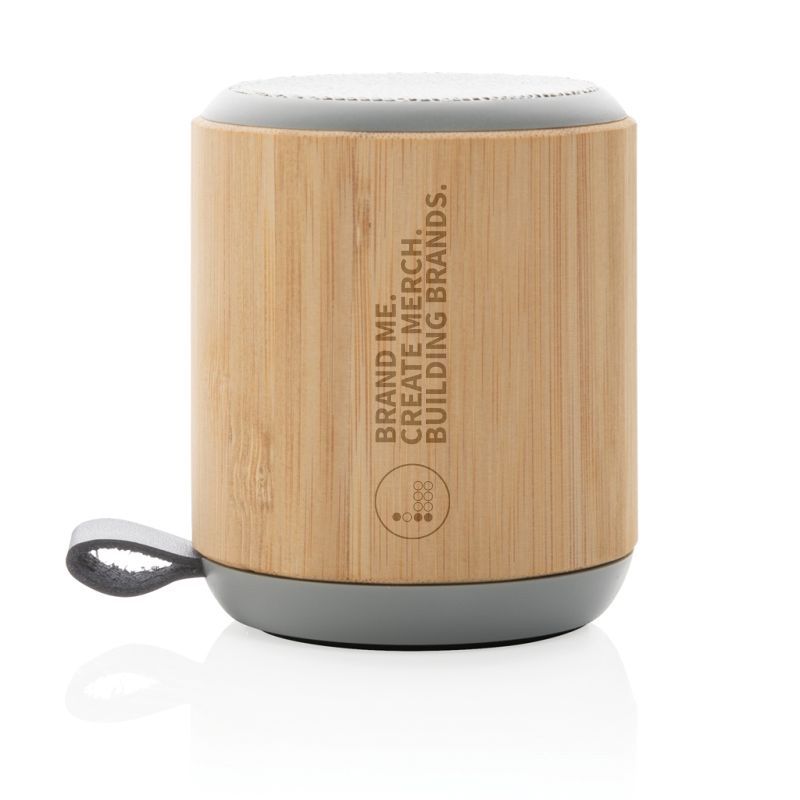 Branded Bamboo and Fabric Wireless Speaker. Bamboo 3W speaker with built-in 300 mAh lithium battery. With playing time of up to 3 hours on one single charge and operating distance of 10m using BT5.0. Made from natural bamboo and fabric.