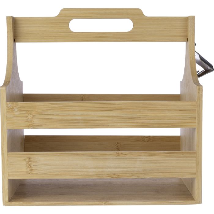 Bamboo bottle holder with bottle opener. Suitable for 6 beer bottles. Individually packaged in a brown carton box.