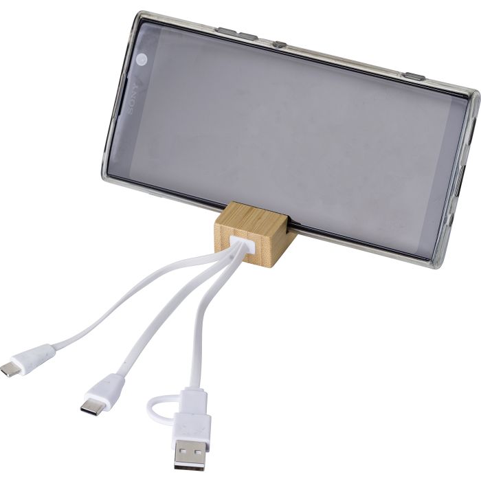 Bamboo keychain phone holder with charging cables. Type-C, lightning and USB-A/C. Individually packaged in a brown cardboard pouch.