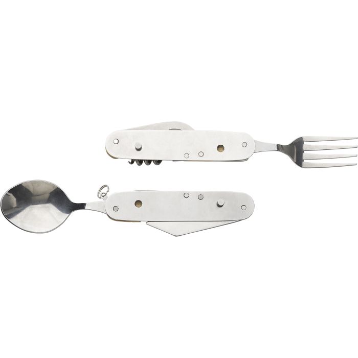 Bamboo multi-functional cutlery set (spoon, fork, knife, bottle opener, small knife). Cutlery can be separated to be used in both hands. Comes individually packaged in a brown cardboard box.