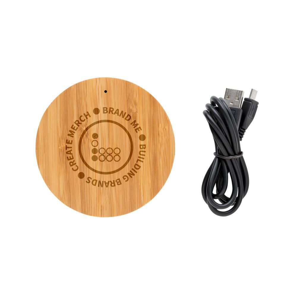 Engraved Bamboo X Round Wireless Charger 5W. Keep your phone charged with this eco 5W wireless charger that will blend perfectly with your home/environment. Simply plug in the Bamboo X wireless charger using the 150 cm micro USB cable to a USB power source and you can charge your phone whenever you want. The casing is made out of durable bamboo and fabric made out of a blend of 30% Organic cotton, Hemp 40% and 30% recycled PET. Wireless charging compatible with all QI enabled devices like Android latest generation, iPhone 8, 8S and X. Input: 5V/2A. Wireless output: 5V/1A 5W. Registered design®. Packed in 100% plastic free packaging.