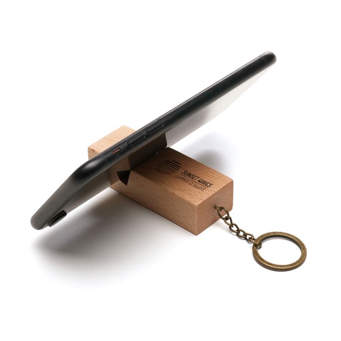 Introducing the stylish and durable Beech Wood Phone Stand Keyring - a practical and elegant promotional merchandise solution for keeping phones secure and easily accessible. Perfect for showcasing your brand in a sophisticated and functional way.