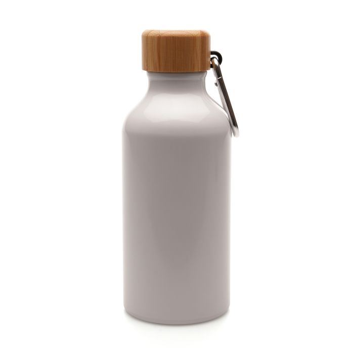 'Berkeley' WHITE 400ml Aluminium Sports Bottle with bamboo lid & carabineer