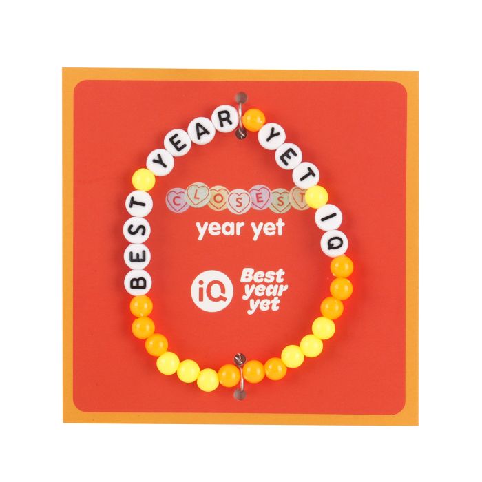 Bespoke plastic beaded bracelet with personalised lettering on a branded backing card for your company's message with the option to add a QR code, all enclosed in a transparent sealed package.