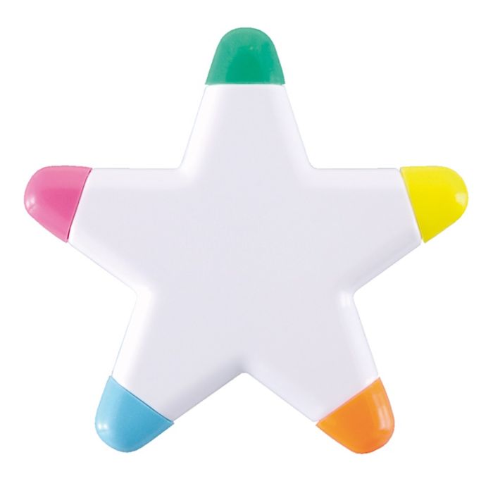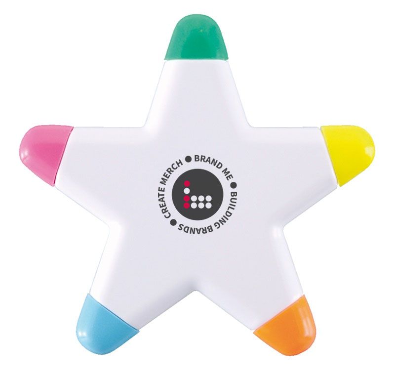 Promotional BG Galaxy Highlighter. Star shaped highlighter with 5 different fluorescent ink colours. The 'cap off' ink will enhance the longevity of the usage. Good print area.