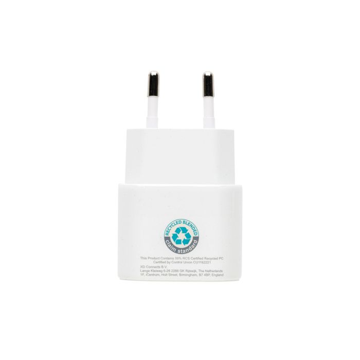 2 pcs 20W fast charging set for mobile devices and other small devices. With EU adapter with 20W USB C port and 120 cm recycled TPE 20W fast charging cable (USB C to USB /Lightning). The cable supports data transfer and also charging of larger devices like laptops. Adapter and cable made from RCS certified recycled PC, ABS and recycled TPE. Packed in pouch made from RCS certified recycled PET. Total recycled content of whole set: 59% based on total item weight. RCS certification ensures a completely certified supply chain of the recycled materials. Packed in FSC® packaging. PVC Free. Input wall charger AC 100-240V 50/60Hz 0.6A; Output wall charger USB-C :5.0V⎓3.0A,9.0V⎓2.22,12.0V⎓1.67A (20W Max);