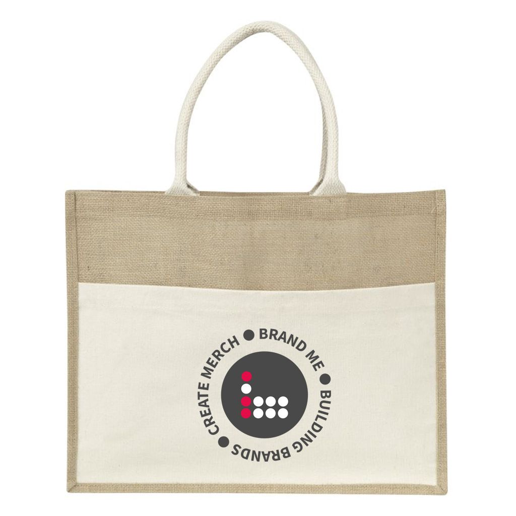 Printed Jute Bag With Front Pocket. A Jute bag with plastic backing, a cotton front pocket, and soft padded carry handles. 288g/10.1oz