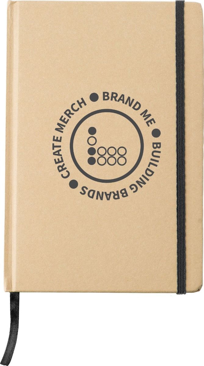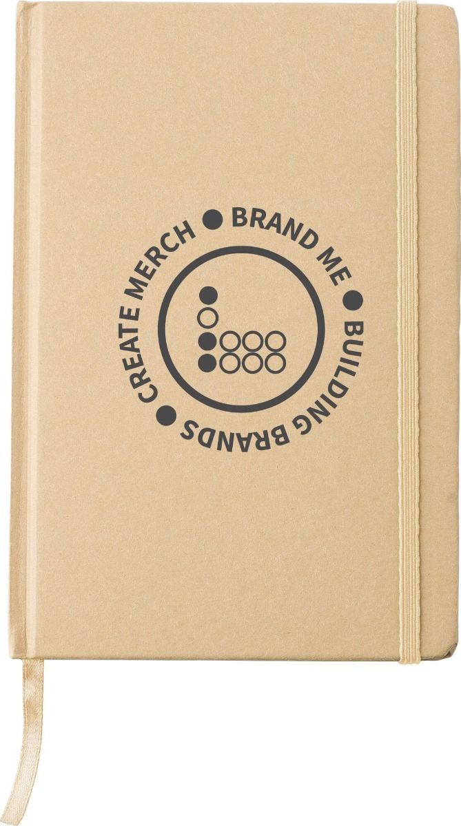 Budget recycled notebook with eight colour options for the elastic band and ribbon bookmark and full brand printing on the front.