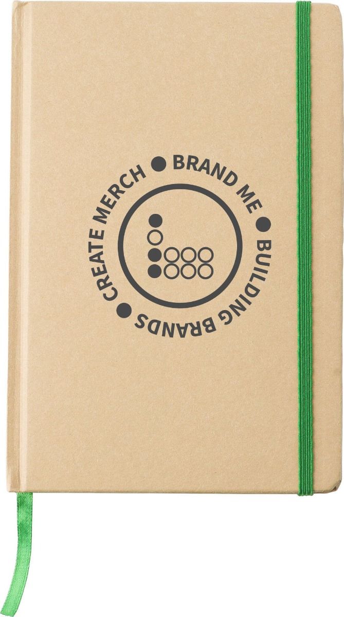 Recycled carton notebook with 80 lined pages, elastic band for closing and a ribbon bookmark, approx A5.