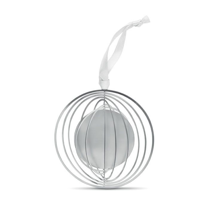 Promotional BUNO Metal Christmas Tree Bauble Decoration. Circular shaped decorative ornament in stainless steel with ribbon in gift envelope. Easily folds flat for mailing and storage.