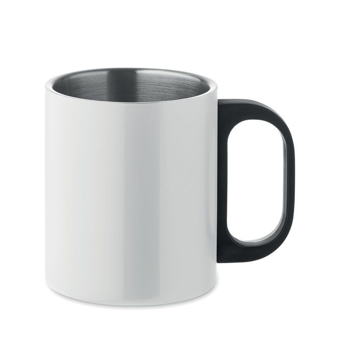 Promotional Camping Style Mug Stainless Steel TANISS. Double wall stainless steel mug with PP handle. Capacity: 300 ml. Start the day in good fashion with a nice cup of coffee or tea. This stainless steel mug with simple design will help you do just that.