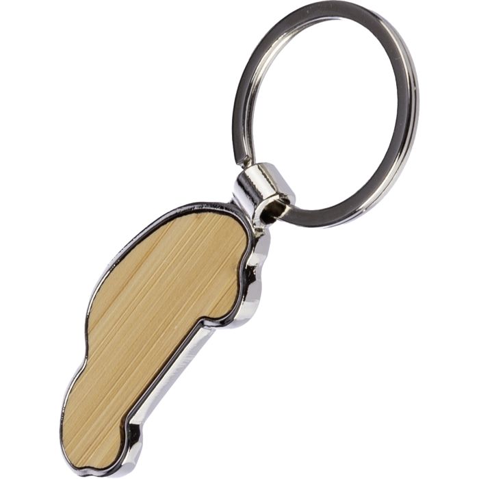 Promotional The Angelike - Car Keyring. A corporate branded Zinc alloy keyring with a bamboo car inlay. Individually packaged in a brown kraft sleeve.