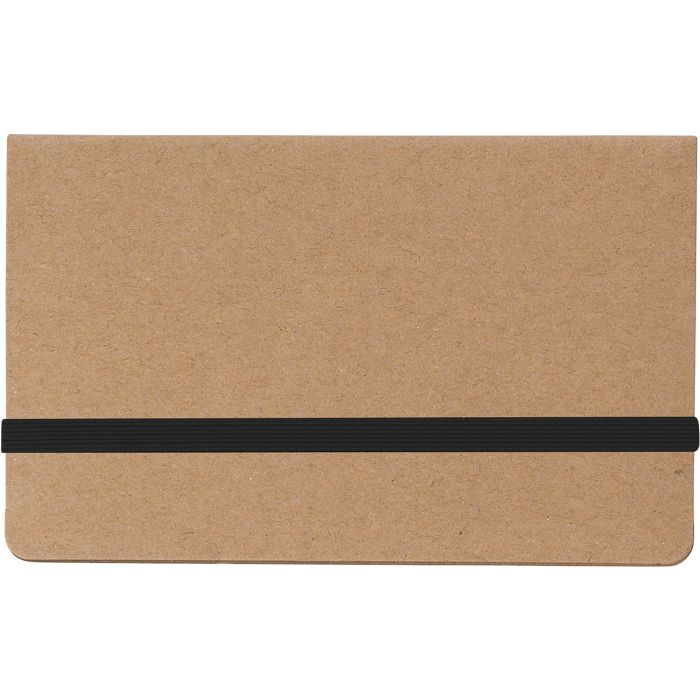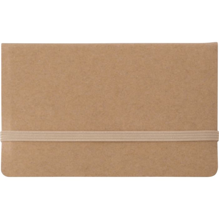 Card booklet with one hundred and fifty sticky notes and inside pocket for business cards. Can be closed with a fabric ribbon.