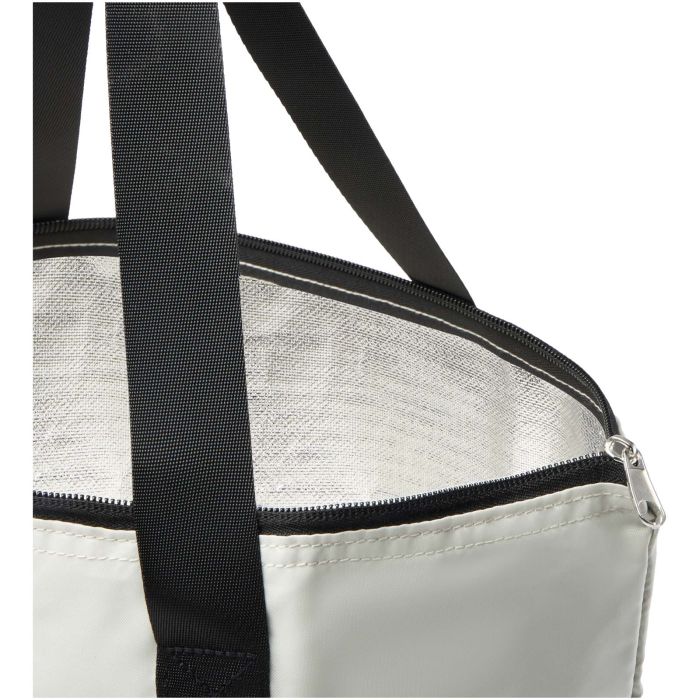 Designed for convenience and practicality, this lightweight yet durable tote cooler bag adapts to your needs by folding neatly into a compact pouch with a webbing loop to hang or carry around easily, making it perfect for picnics, grocery shopping, or outdoor adventures. Featuring a zipped main compartment with aluminium foil, a front open pocket, and two long handles made of quality smooth webbing material. Made of PVC free recycled polyester. Volume capacity: 15 litres.