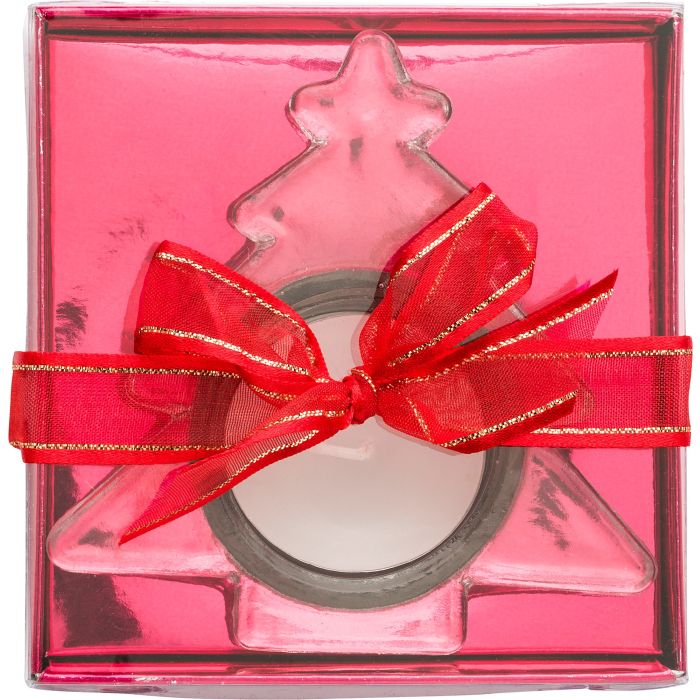 Glass Christmas tree shaped holder with a tea light candle, supplied in a gift box with ribbon.