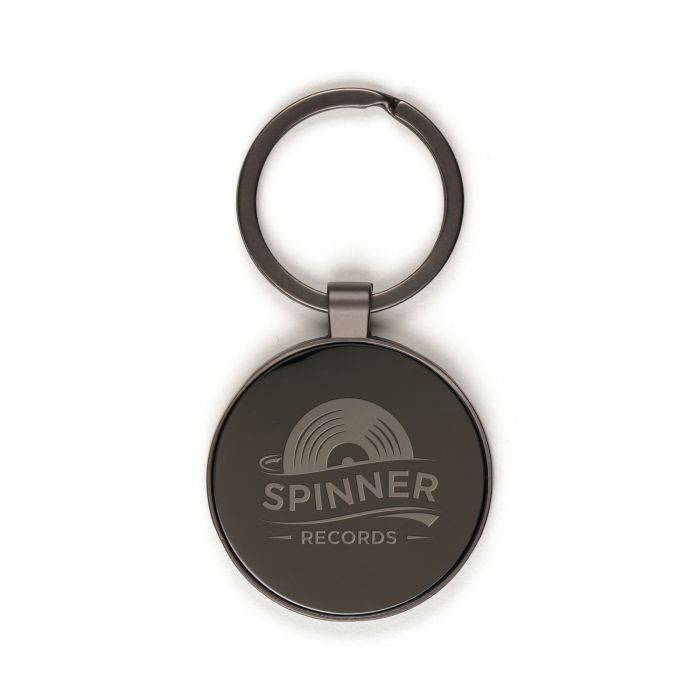 A sleek round keyring made from durable zinc alloy featuring an iron split ring and a metal plate for added strength. Finished in an elegant gun metal colour.
