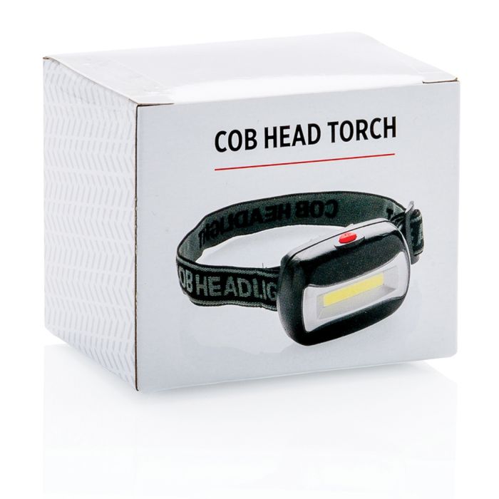 Branded COB Head Torch With Adjustable Head Band. ABS head torch with ultra-bright COB torch. Including adjustable headband to fit all sizes. Including batteries.