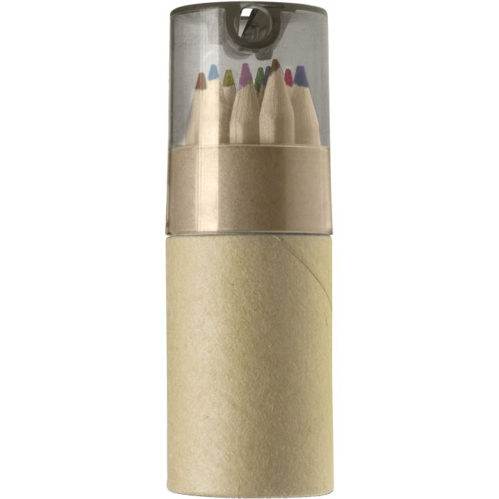 Twelve promotional colour pencils in a cylindrical case with a handy plastic sharpener as the cap.