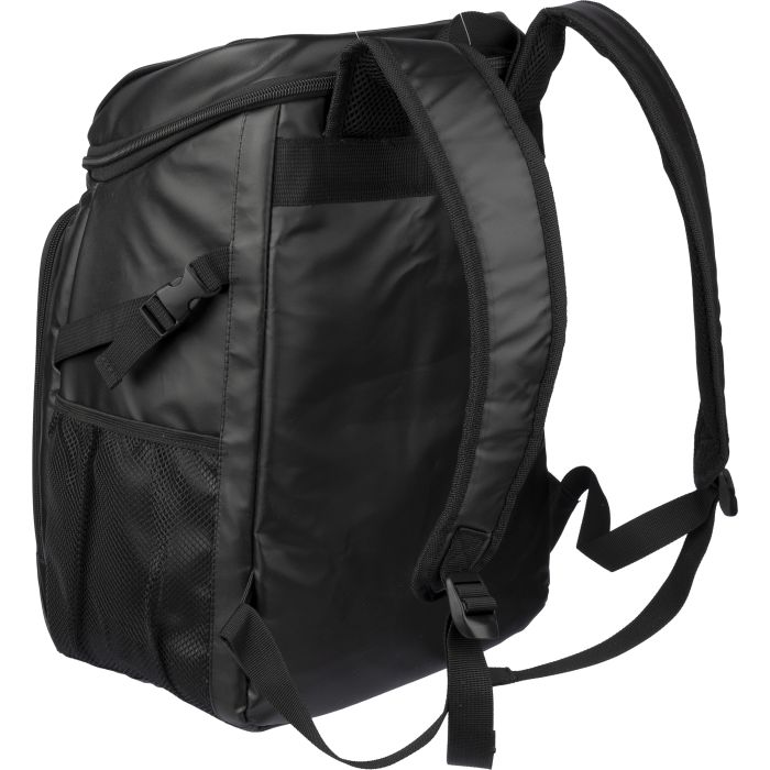 Polyester (600D) and PU cooler backpack with PEVA interior. The bag includes 10mm PE foam and a waterproof interior, a large zipped compartment on the topside and a zipped pocket on the front. On the side there is a mesh bottle compartment with an elastic closing band.