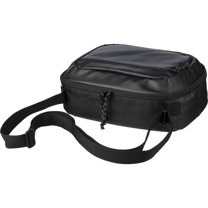 Polyester (600D) waist bag with PEVA foil lining. The bag features a main zipped compartment on the topside, a zipped pocket on the front and an adjustable shoulder strap.