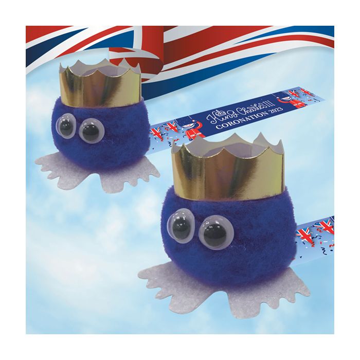 Promotional Coronation Logobug With Crown. Custom branded Logo Bugs to celebrate King Charles III coronation. Our customised Coronation Logo Bugs are a great low cost promotional item to celebrate the up coming Kings Coronation. An ideal giveaway to show your support when the country will come together over this exciting long weekend of joy and celebration. Our promotional Coronation Logo Bugs come wearing a crown and a ribbon attached with Coronation theme or your own promotional message and logo printed in full colour.