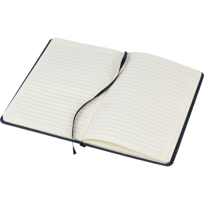 Denim notebook (approx. A5) with 80 lined pages, ribbon marker and elastic band closing.