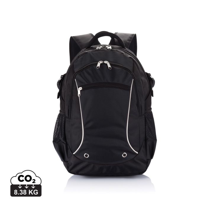 Promotional Denver Laptop Backpack PVC Free. 1680D and jacquard backpack. Zippered front pocket with organiser. Zippered main compartment with 15,6” padded laptop pocket. Reflective piping. Two side mesh pockets. PVC free.