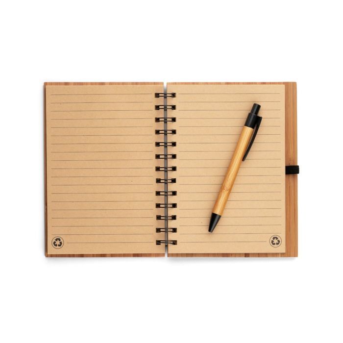 Bamboo hardcover A5 spiral-bound notepad, with 140 lined pages of 100% recycled ivory-colored paper (70/m²) and pen holder (pen included). Bamboo ballpoint pen with blue writing. As the product is made from natural materials, the colour and the printing result may vary between products. 135 x 180 mm