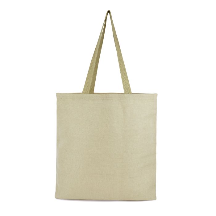 240gsm natural juco shopper with long flat cotton webbing handles. Made from 67% jute and 33% cotton.