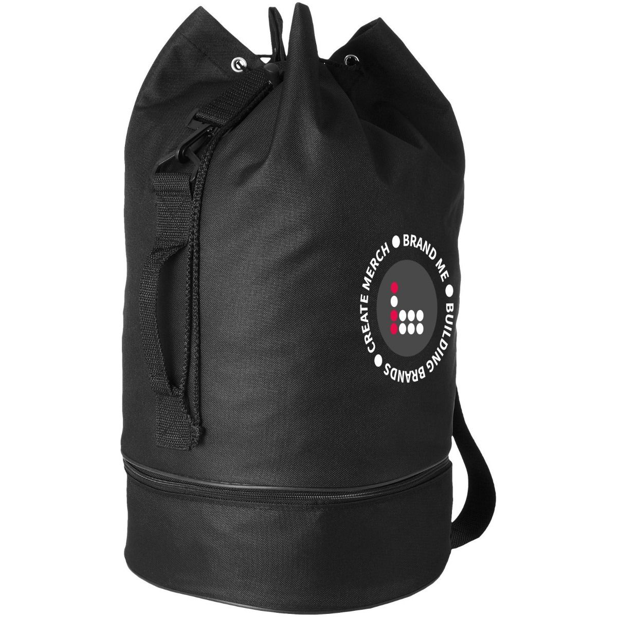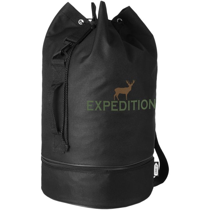 Promotional Recycled Idaho Sailor Duffel Bag made from RPET. Water resistant duffel sailor bag made from recycled PET plastic with a spacious 20 litres main compartment with drawstring closure, side handle, and adjustable shoulder strap. Also features a separate zippered bottom compartment for smaller items.